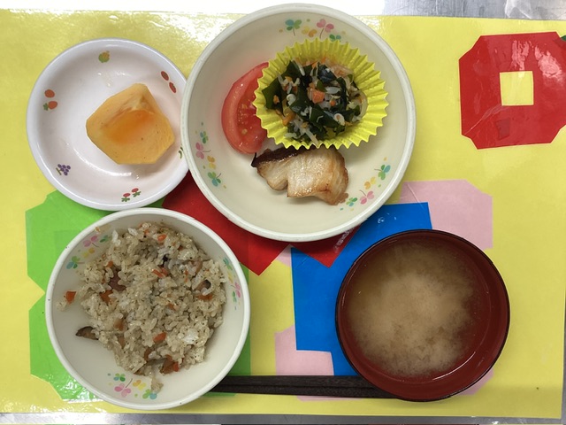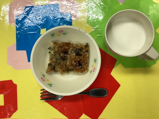 ホームきょうの給食 10/17 今日の給食 2025年10月17日 子どもたちが大好きな給食やおやつを毎日紹介しています! 【幼児食・乳児食】 昼食 かやくごはん みそ汁 銀だらの照り焼き わかめのナムル風 トマト 柿 3時のおやつ 牛乳 お好み焼き 10時のおやつ(乳児のみ) ジョア