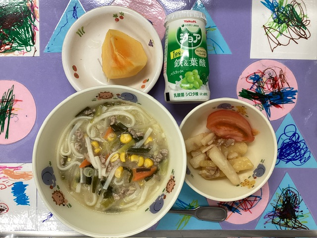 ホームきょうの給食 11/1 今日の給食 2025年11月1日 子どもたちが大好きな給食やおやつを毎日紹介しています! 【幼児食・乳児食】 昼食 みそう〜どん 根菜ソテー トマト ジョア 柿 3時のおやつ 麦茶 ゆかりおにぎり ぬか漬け 10時のおやつ(乳児のみ) 野菜ジュース