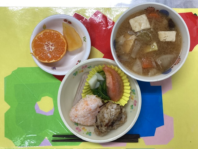 ホームきょうの給食 11/7 今日の給食 2025年11月7日 子どもたちが大好きな給食やおやつを毎日紹介しています! 【幼児食・乳児食】 昼食 おにぎり2種 鮭・昆布 (乳:鮭ごはん) スペシャル豚汁 ウインナー 塩もみ野菜 トマト みかん・柿 3時のおやつ 牛乳 ジャムサンド 10時のおやつ(乳児のみ) 野菜ジュース