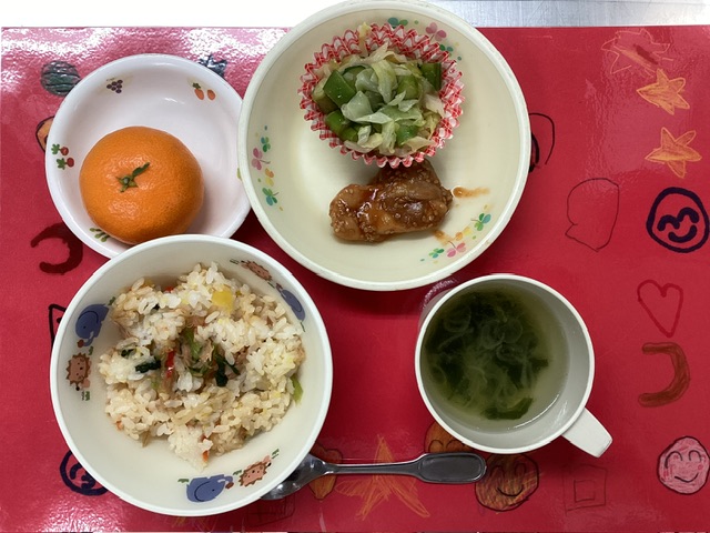 ホームきょうの給食 12/1 今日の給食 2025年12月1日 子どもたちが大好きな給食やおやつを毎日紹介しています! 【幼児食・乳児食】 昼食 ツナきびビビンバ わかめスープ 甘辛チキン グリーンサラダ みかん 3時のおやつ 牛乳 あんぱん 10時のおやつ(乳児のみ) 野菜ジュース