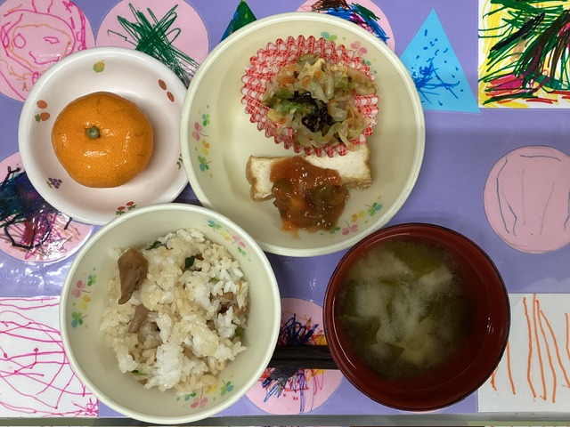 ホームきょうの給食 12/3 今日の給食 2025年12月3日 子どもたちが大好きな給食やおやつを毎日紹介しています! 【幼児食・乳児食】 昼食 まいたけごはん みそ汁 厚揚げのケチャップあん キャベツの昆布和え みかん 3時のおやつ 牛乳 ココアマシュマロフレーク 10時のおやつ(乳児のみ) 牛乳