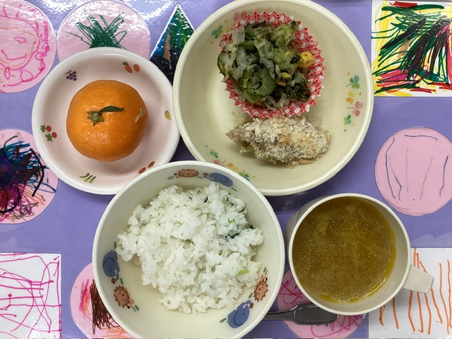 ホームきょうの給食 12/17 今日の給食 2025年12月17日 子どもたちが大好きな給食やおやつを毎日紹介しています! 【幼児食・乳児食】 昼食 青菜ごはん わんたんスープ さつまいもスコップコロッケ チョレギサラダ みかん 3時のおやつ 野菜ジュース みそう〜どん 10時のおやつ(乳児のみ) 牛乳