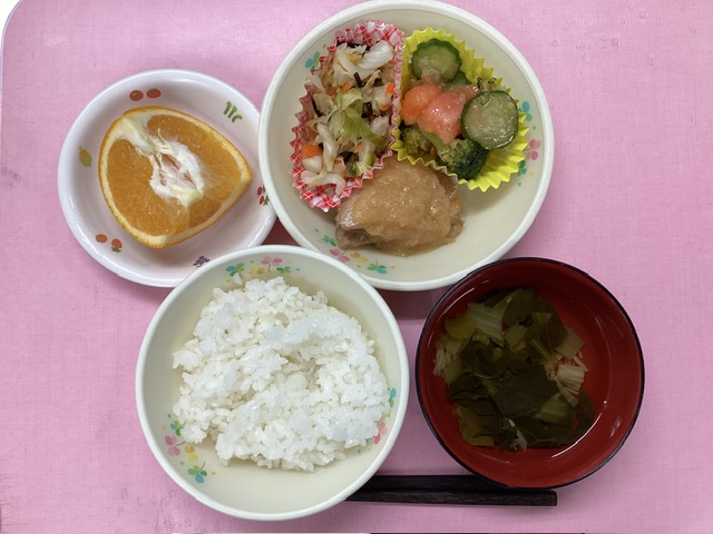 ホームきょうの給食 1/15 今日の給食 2025年1月15日 子どもたちが大好きな給食やおやつを毎日紹介しています! 【幼児食・乳児食】 昼食 ごはん すまし汁 鶏肉のねぎみそ焼き トマトサラダ キャベツの昆布和え いよかん 3時のおやつ 牛乳 たくあんおにぎり 食べる小魚 10時のおやつ(乳児のみ) 牛乳