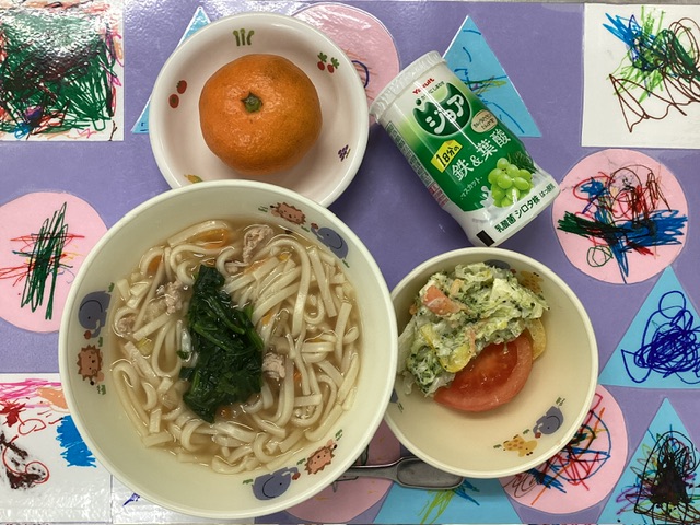 ホームきょうの給食 1/17 今日の給食 2026年1月17日 子どもたちが大好きな給食やおやつを毎日紹介しています! 【幼児食・乳児食】 昼食 豚肉ときのこのうどん キャベツとりんごのサラダ トマト ジョア みかん 3時のおやつ 麦茶 ハムピラフ スティック人参 10時のおやつ(乳児のみ) 野菜ジュース