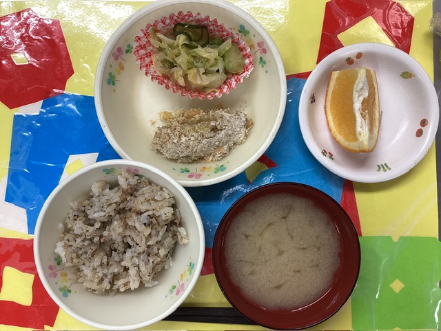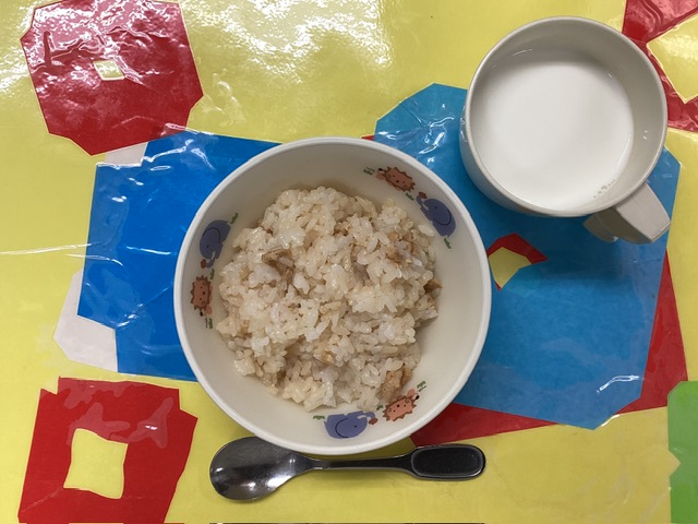 ホームきょうの給食 1/20 今日の給食 2026年1月20日 子どもたちが大好きな給食やおやつを毎日紹介しています! 【幼児食・乳児食】 昼食 豚肉とえのきのご飯 みそ汁 さつまいもスコップコロッケ グリーンサラダ いよかん 3時のおやつ 牛乳 こぎつねごはん 10時のおやつ(乳児のみ) 牛乳