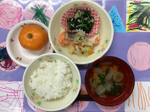 ホームきょうの給食 1/21 今日の給食 2026年1月21日 子どもたちが大好きな給食やおやつを毎日紹介しています! 【幼児食・乳児食】 昼食 ごはん 根菜汁 鮭のちゃんちゃん焼き 磯辺和え みかん 3時のおやつ ジョア ラーメン (乳:中華うどん) 10時のおやつ(乳児のみ) 牛乳