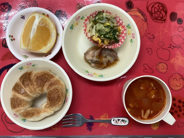 ホームきょうの給食 1/22 今日の給食 2026年1月22日 子どもたちが大好きな給食やおやつを毎日紹介しています! 【幼児食・乳児食】 昼食 クロワッサン ミネストローネ チキンのマーマレード煮 ミックスサラダ はっさく 3時のおやつ 牛乳 そぼろおにぎり ぬか漬け 10時のおやつ(乳児のみ) 野菜ジュース