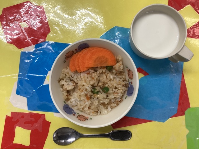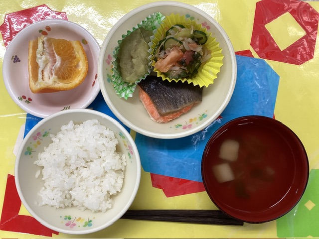 ホームきょうの給食 2/24 今日の給食 2026年2月24日 子どもたちが大好きな給食やおやつを毎日紹介しています! 【幼児食・乳児食】 昼食 ごはん すまし汁 鮭の西京焼き さつまいもの甘煮 和風サラダ いよかん 3時のおやつ 牛乳 炊き込みごはん ぬか漬け 10時のおやつ(乳児のみ) ジョア
