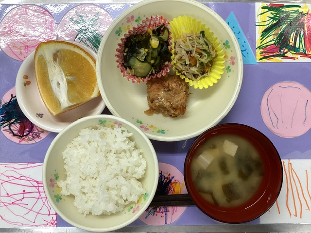 ホームきょうの給食 3/25 今日の給食 2026年3月25日 子どもたちが大好きな給食やおやつを毎日紹介しています! 【幼児食・乳児食】 昼食 ごはん みそ汁 から揚げ ビーフンの炒め物 酢の物 甘夏 3時のおやつ 牛乳 山芋入りお好み焼き 10時のおやつ(乳児のみ) ジョア