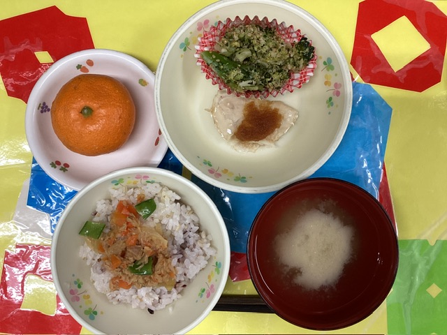 ホームきょうの給食 1/13 今日の給食 2026年1月13日 子どもたちが大好きな給食やおやつを毎日紹介しています! 【幼児食・乳児食】 昼食 ツナ雑穀丼 (乳:ツナ丼) みそ汁 かじきのBBQソース ブロッコリーのごま和え みかん 3時のおやつ 牛乳 バナナケーキ 10時のおやつ(乳児のみ) 野菜ジュース