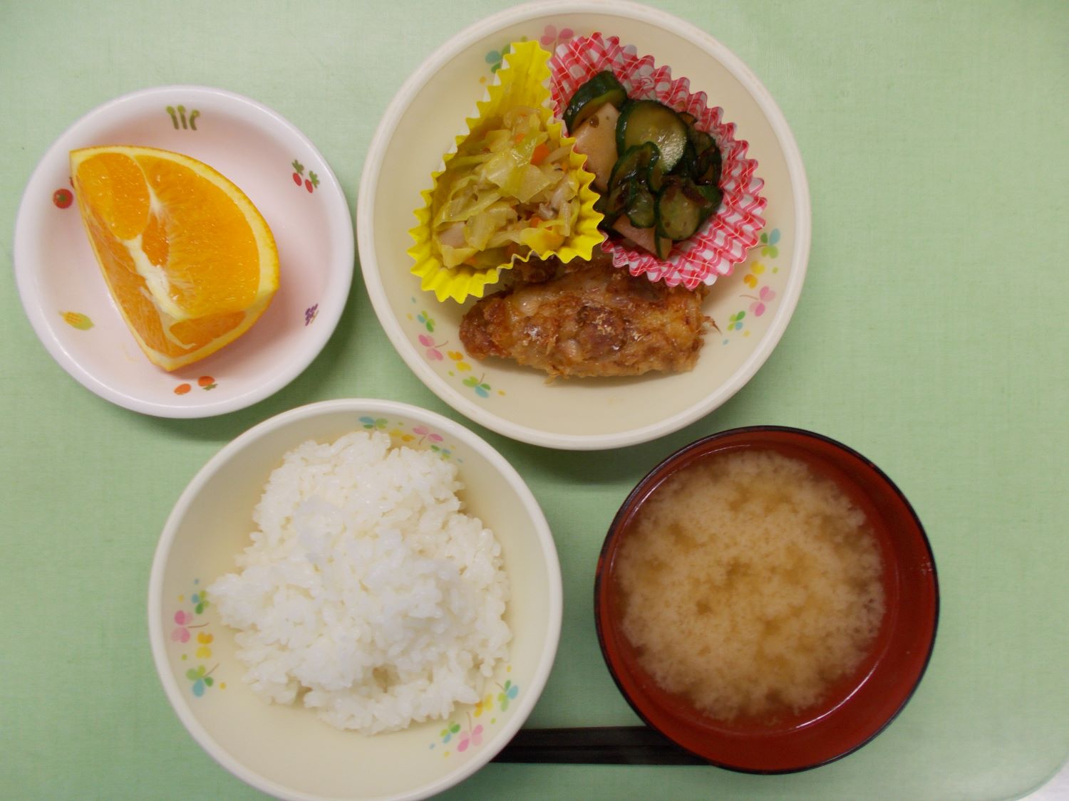 ごはん、みそ汁、からあげ、豆腐サラダ、小松菜のおひたし、メロン