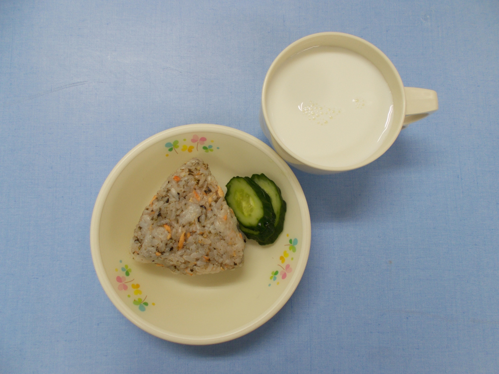 おかか麦ごはん(乳:おかかごはん)、すまし汁、鮭の西京焼き、キャベツの昆布和え、トマト、すいか