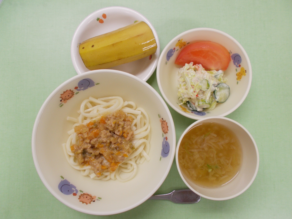 肉みそうどん、かき玉汁、キャベツとりんごのサラダ、オレンジ |