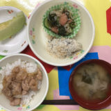わかめごはん、みそ汁、からあげ、スパゲティーサラダ、りんご